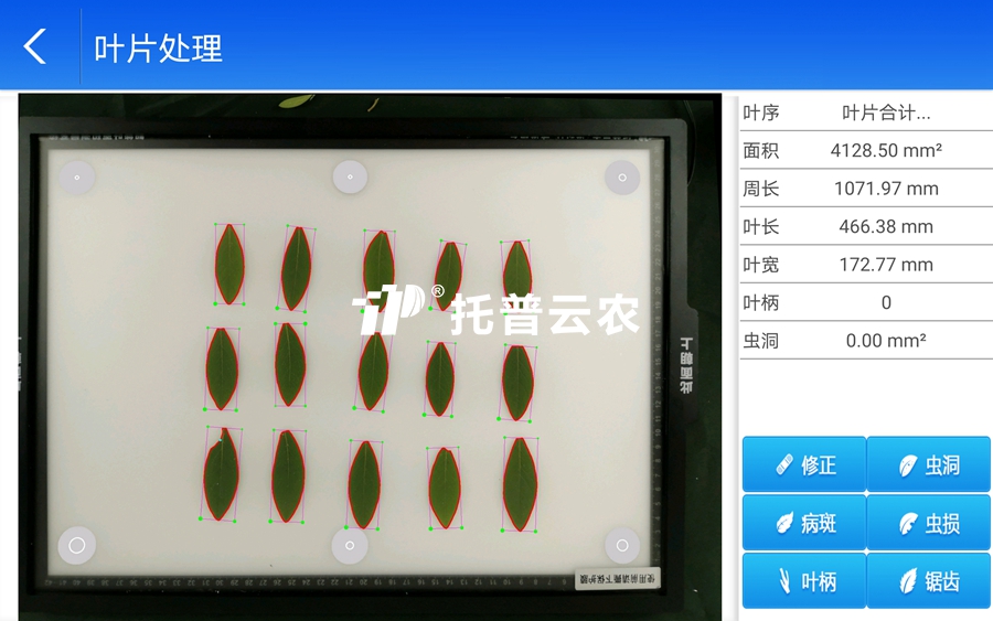 7、带有手动修正功能, 可进行剪切、修补、自动切叶柄、选取颜色分析面积等功能,确保测量结果的高精度。