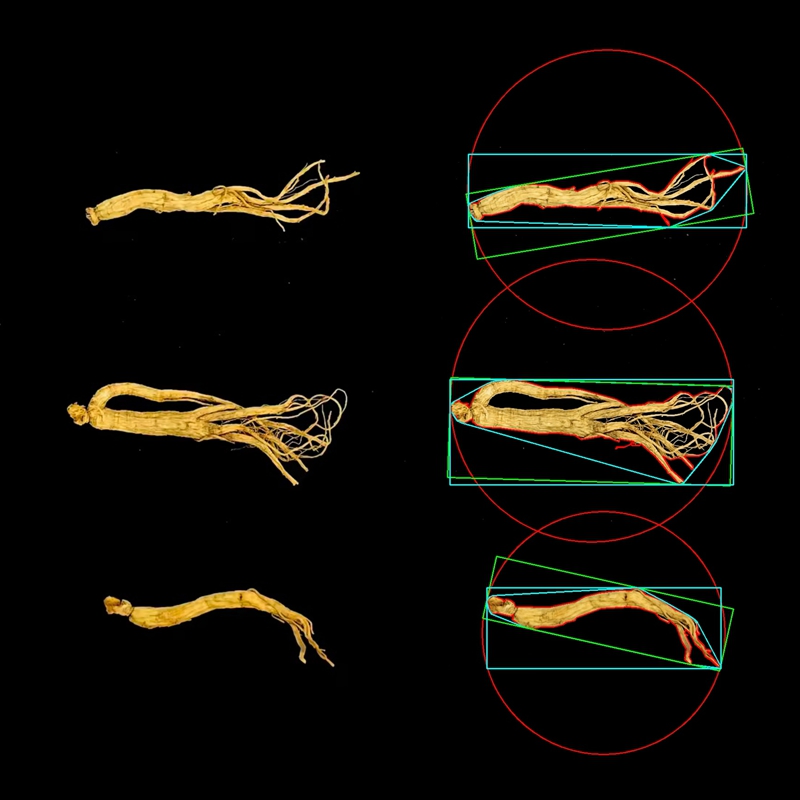 - 中药材形态解析:基于先进视觉算法,在3秒内自动完成目标识别与分割,精准解析中药材轮廓、直径、长度、宽度、周长、颜色、数量等关键表型性状。