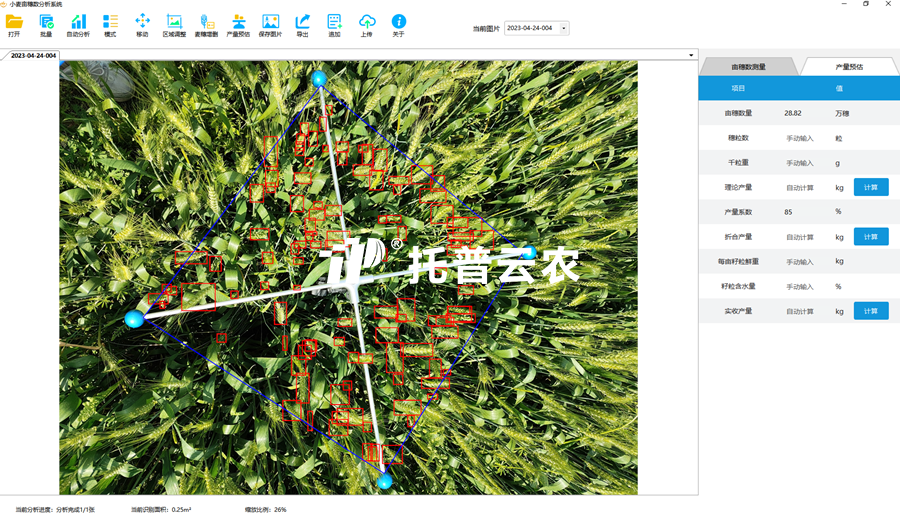 小麦亩穗数测量系统采用图像识别技术、深度学习的方法,可以测小麦亩穗数、理论产量、种子数量和千粒重指标,对小麦的品种筛选、小麦产量预测、高产栽培、良种选育、产量基因定位和功能解析发挥着至关重要的作用,适用于农科院、学校,育种公司,种子站等。